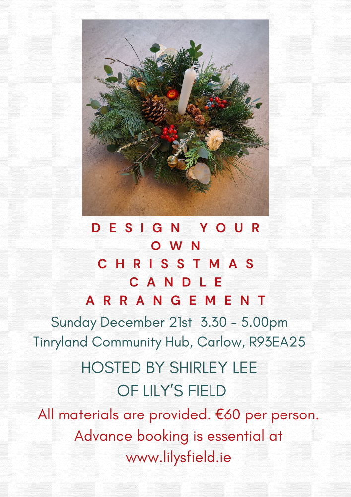This is our last workshop of the year. Come along for a relaxed afternoon making a beautiful candle arrangement for your home. Using fresh winter foliage and cones, along with a choice of additional decorative elements such as honesty, oranges and dried flowers. Your arrangement should last a minimum of 7 days in peak condition.