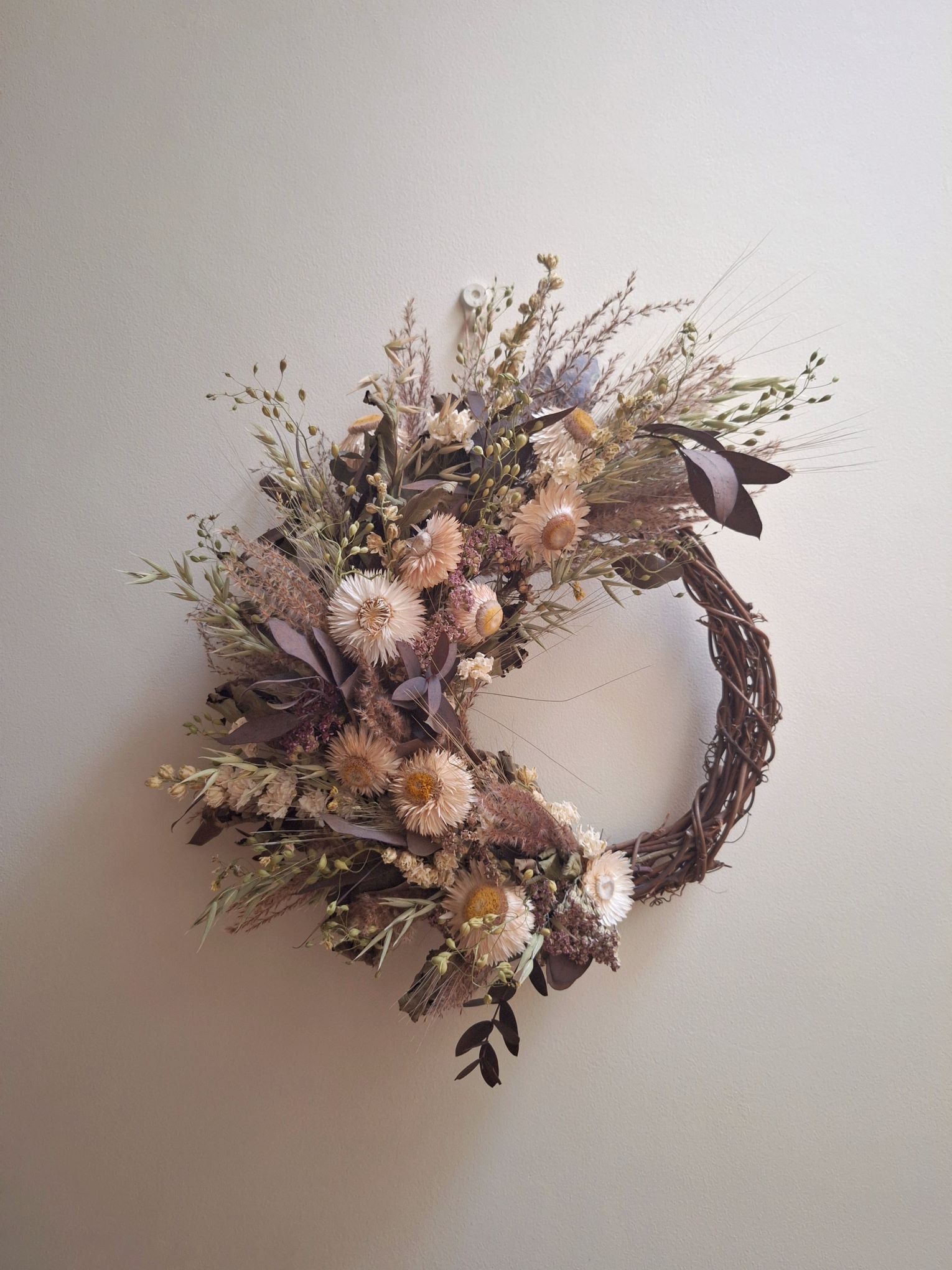 A natural vine base 25cm in diameter decorated with a selection of flowers, foliage and grasses grown on our farm. Includes our preserved Eucalyptus, Helichrysums, larkspur and Miscanthus. It is 35cm at it’s widest and suitable for indoor use only.